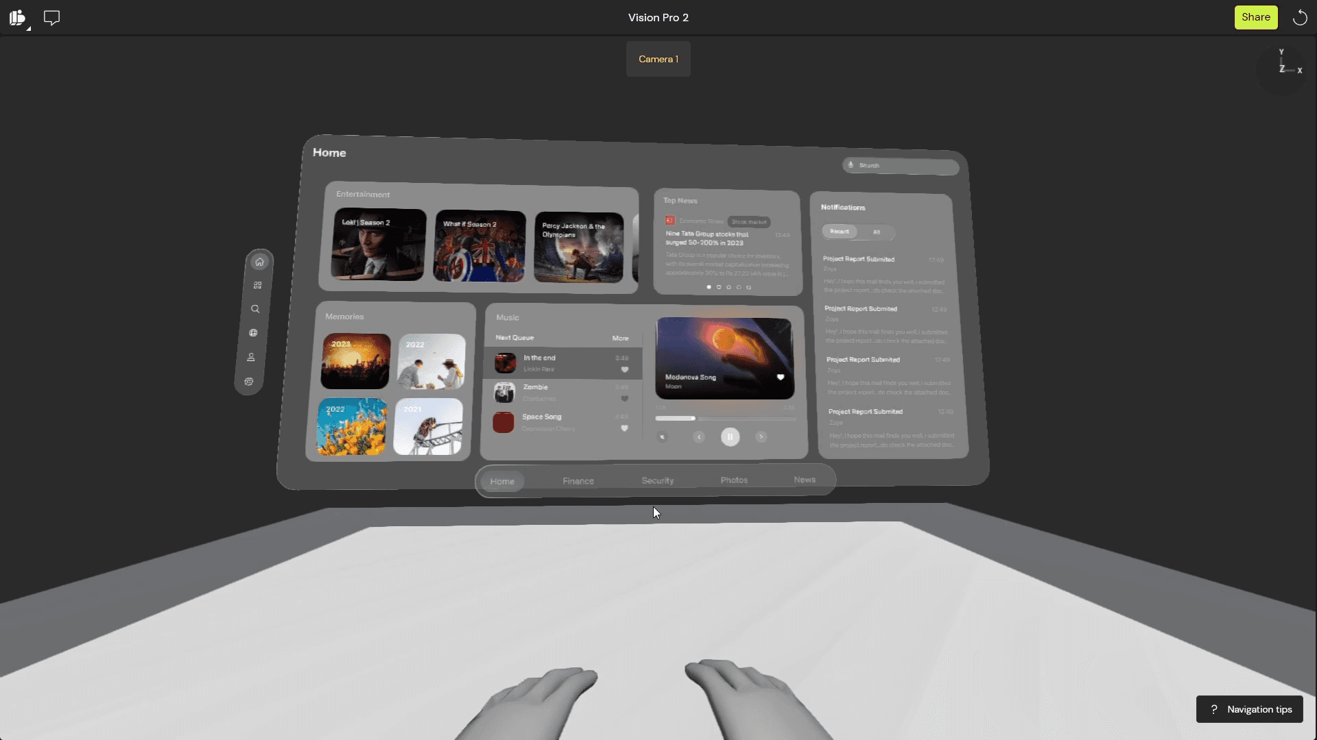 Designed this simple UI design for Apple Vision pro, I followed apple's vision pro design guidelines while designing the UI. Used Figma and Bezi app to make the design.